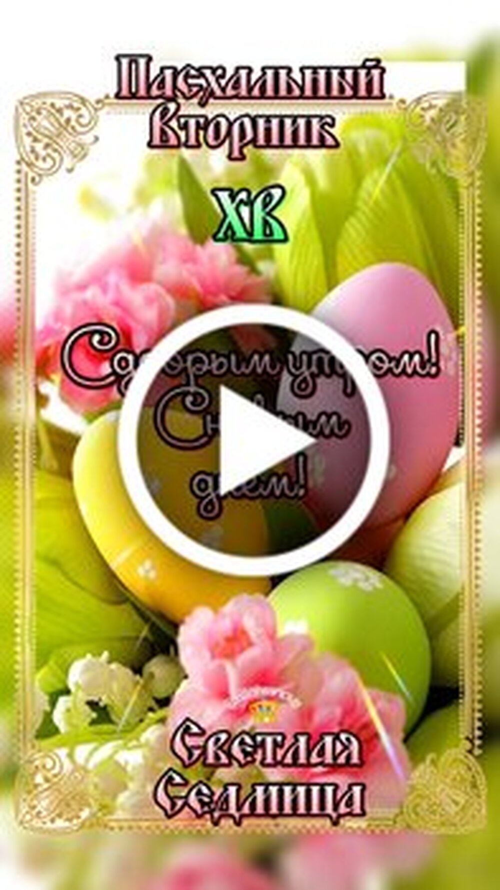 Красивое поздравительное видео к Пасхальному вторнику. В первой части ролика показаны яркие пасхальные яйца в окружении нежных весенних цветов, сопровождаемые теплыми пожеланиями доброго утра и светлой Пасхи. Во второй части видео акцент смещается на весеннюю природу, цветущие деревья и золотые купола православного храма на фоне ясного неба. Видео наполнено атмосферой радости, света и праздника, завершаясь пожеланием доброго весеннего дня.