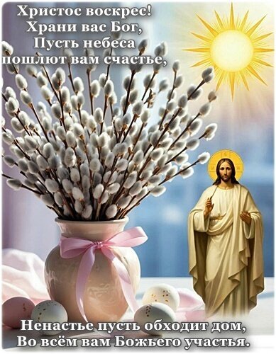 Христос воскрес! Храни вас Бог, пусть небеса пошлют вам счастье. Ненастье пусть обходит дом, во всём вам Божьего участья.
