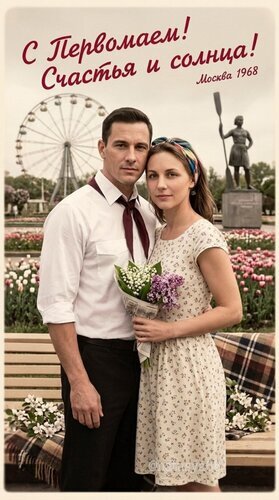 Ретро-поздравление с Первомаем в стилистике Москвы 1968 года. На изображении молодая пара в винтажной одежде: мужчина в белой рубашке с галстуком и женщина в легком платье в цветочек, держащая букет тюльпанов. На заднем плане видны колесо обозрения, парк и памятник, создающие атмосферу советского праздника. Текст на картинке гласит: «С Первомаем! Счастья и солнца! Москва 1968». Идеально подходит для ностальгических открыток и тематических постов.