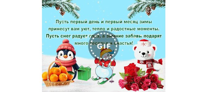 Анимированная открытка "С первым днём и первым месяцем зимы!"