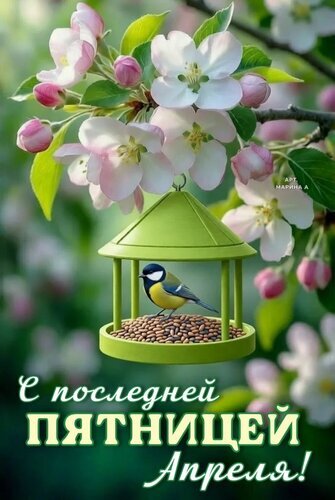 Красивая поздравительная открытка к последней пятнице апреля. На изображении запечатлена нежная весенняя композиция: цветущие яблони с розовыми и белыми цветами, на фоне которых висит изящная зеленая кормушка с семенами, в которой сидит маленькая яркая птичка. В нижней части картинки расположена праздничная надпись на русском языке: «С последней пятницей апреля!». Идеально подходит для отправки друзьям и близким в мессенджерах и социальных сетях для создания весеннего настроения.