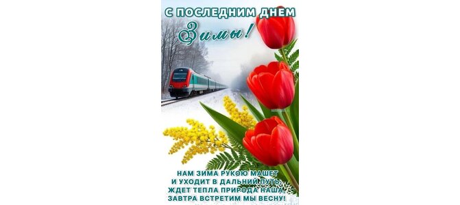 Открытка "С ПОСЛЕДНИМ ДНЕМ ЗИМЫ! НАМ ЗИМА РУКОЮ МАШЕТ И УХОДИТ В ДАЛЬНИЙ ПУТЬ, ЖДЕТ ТЕПЛА ПРИРОДА НАША, ЗАВТРА"