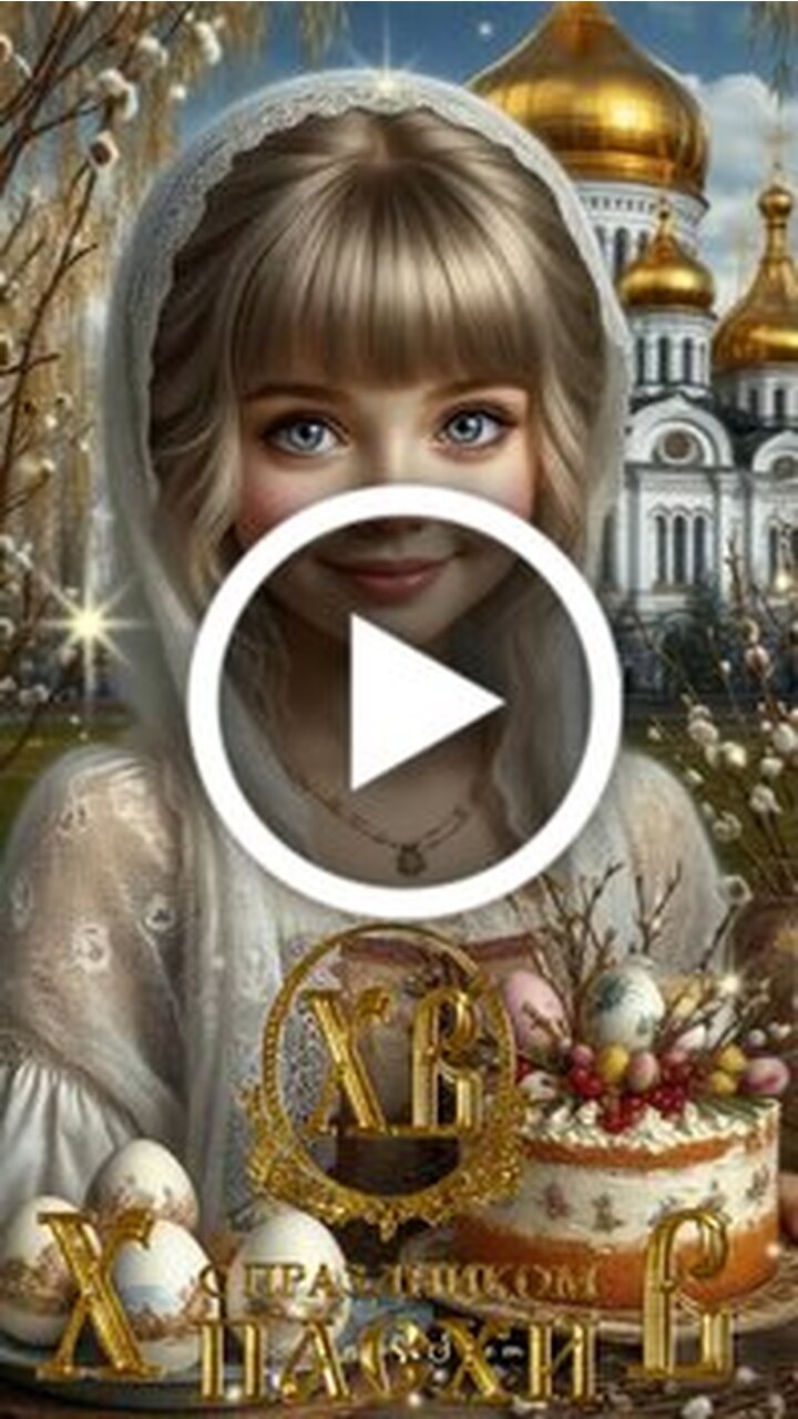 Красивое поздравительное видео к празднику Пасхи. На фоне величественного православного собора с золотыми куполами изображена молодая девушка в светлом платке. Она улыбается и держит праздничный кулич и пасхальные яйца. Сюжет видео передает светлую и торжественную атмосферу весеннего праздника светлого Христова Воскресения. В кадре появляются летящие белые голуби как символ мира и чистоты. Видео наполнено золотистым сиянием и праздничной эстетикой идеально подходит для отправки близким и друзьям в качестве теплого поздравления с Пасхой.