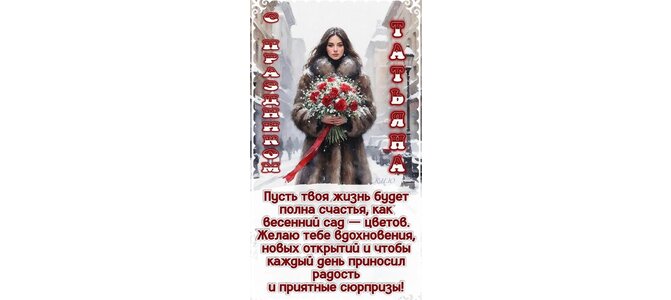 Открытка "С праздником, Татьяна. Пусть твоя жизнь будет полна счастья, как весенний сад - цветов..."