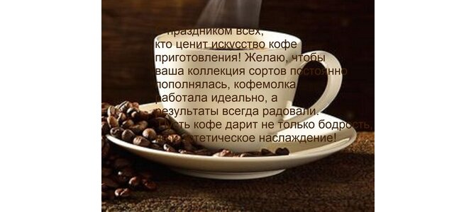 Теги:с праздником всех, кто ценит искусство кофеприготовления желаю, чтобы ваша коллекция сортов постоянно пополнялась, кофемолка работала идеально, результаты, всегда, радовали, пусть, кофе, дарит, только, бодрость, но и эстетическое наслаждение