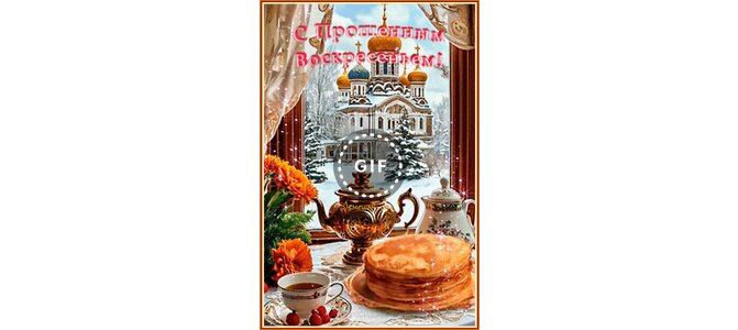 Теги:за окном церковь, голубь в небе, стол, тарелка с блинами, чайник, кувшин, чашечка чая, блюдце, букет цветов, 3d текст
