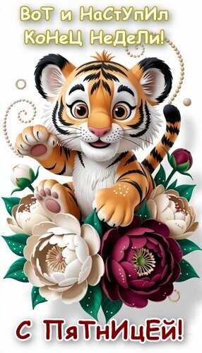Милая и яркая открытка с изображением очаровательного маленького тигренка, окруженного пышными розами. На картинке красуется поздравительная надпись на русском языке: «Вот и наступил конец недели! С пятницей!». Иллюстрация выполнена в мультяшном стиле с использованием сочных цветов, что делает её идеальной для отправки друзьям и близким в мессенджерах и социальных сетях для создания праздничного настроения в пятницу.