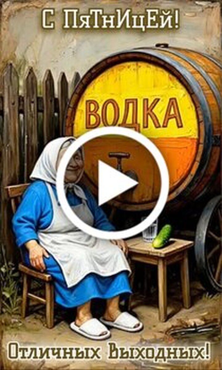 Юмористическая анимация на тему наступления пятницы. На видео изображена пожилая женщина в платке и фартуке, которая сидит на улице рядом с большой деревянной бочкой с надписью водка. Сюжет представляет собой зацикленную и забавную последовательность действий, где героиня то просто улыбается, то наливает напиток в стакан, то весело пьет его, сопровождая процесс огурцом. Видео наполнено позитивным настроем и предвкушением отдыха. Текст на экране поздравляет зрителей с пятницей и желает отличных выходных.