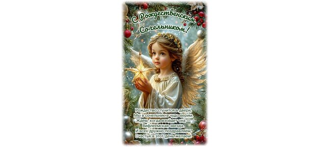 С Рождественским сочельником! Рождество стучится в двери, мы в сочельник в чудо верим, ждем, когда взойдет она — Вифлеемская звезда. И всех дружно поздравляем, счастья в этот день желаем!
