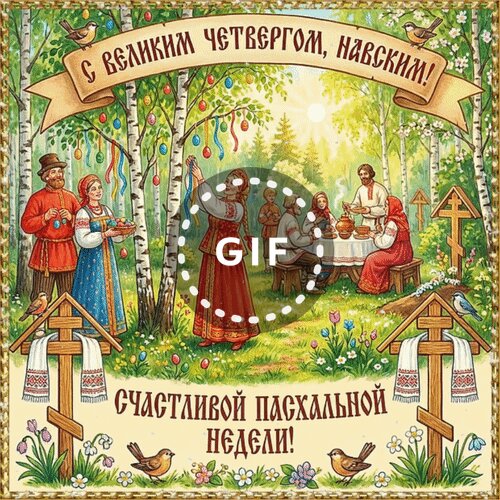 Иллюстрация к празднику Великого четверга и Пасхи в традиционном славянском стиле. На картине изображена идиллическая сцена: люди в народных костюмах проводят время на природе в светлом березовом лесу. Группа людей празднует за столом, женщина в красном сарафане стоит среди деревьев, украшенных пасхальными яйцами. На переднем плане видны деревянные кресты, украшенные вышитыми рушниками, и весенние цветы. Теплая, солнечная цветовая гамма и присутствие птиц создают атмосферу радости, духовности и весеннего обновления. Идеально подходит для поздравительных открыток к Пасхальной неделе.
