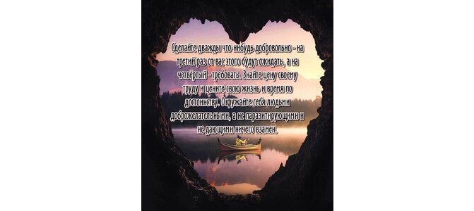 Сделайте дважды что-нибудь добровольно - на третий раз от вас этого будут ожидать, а на четвёртый - требовать. Знайте цену своему труду и цените свою жизнь и время по достоинству. Окружайте себя людьми доброжелательными, а не паразитирующими и не дающими ничего взамен.