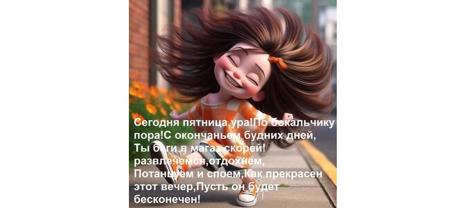 Теги:сегодня пятница, ура, бокальчику, пора, окончаньем, будних, дней, ты беги в магаз скорей развлечемся, отдохнем, потанцуем и споем, как прекрасен этот вечер, пусть он будет бесконечен