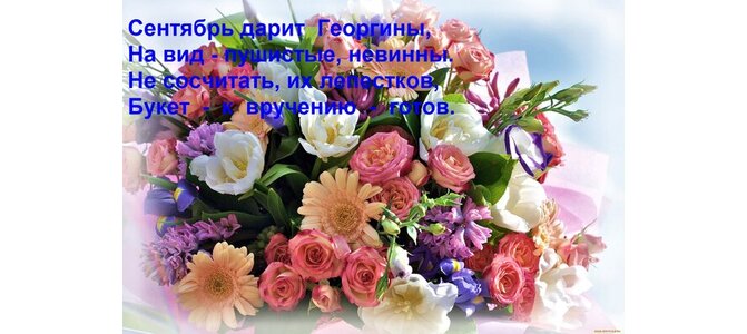 Теги:сентябрь дарит георгины, на вид - пушистые, невинны не сосчитать, их лепестков, букет - к вручению - готов