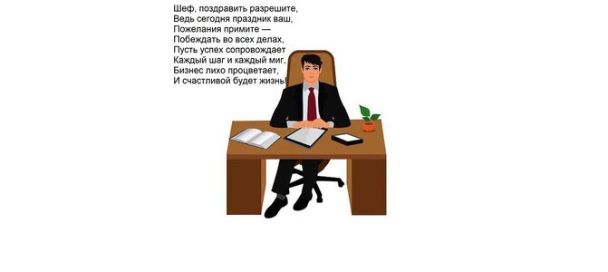 Теги:шеф, поздравить разрешите, ведь сегодня праздник ваш, пожелания примите побеждать во всех делах, пусть успех сопровождает каждый шаг и каждый миг, бизнес лихо процветает, и счастливой будет жизнь