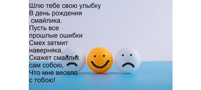 Открытка "Шлю тебе свою улыбку В день рождения смайлика. Пусть все прошлые ошибки Смех затмит наверняка. Скаже"