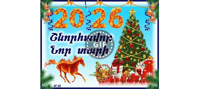 Анимированная открытка "Шноравор Нор тари - Поздравляю с Новым годом!, (Մ․Ս․), (М. С.) на армянском языке"