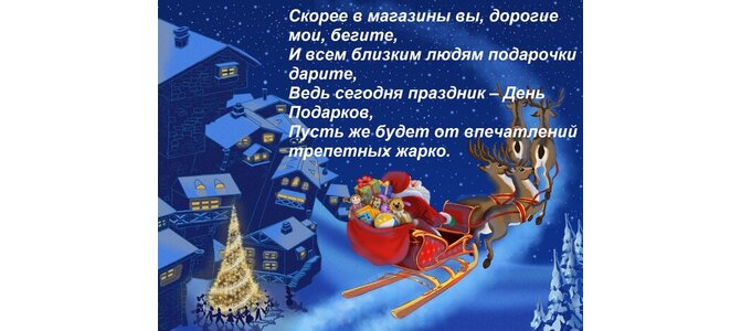Теги:скорее в магазины вы, дорогие мои, бегите, и всем близким людям подарочки дарите, ведь сегодня праздник день подарков, пусть же будет от впечатлений трепетных жарко