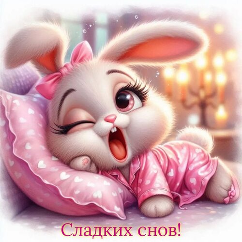 Мультяшная зайка засыпает в своей кроватке "Сладких снов!"