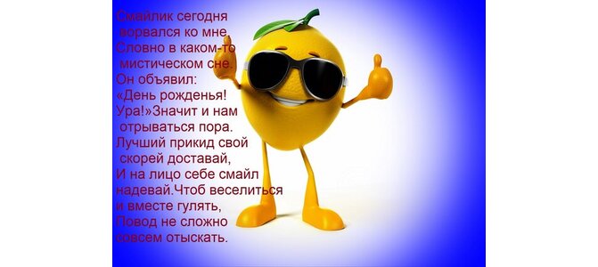Теги:смайлик сегодня ворвался ко мне, словно, каком-то, мистическом, сне, объявил, день, рожденья, ура, значит, нам, отрываться, пора