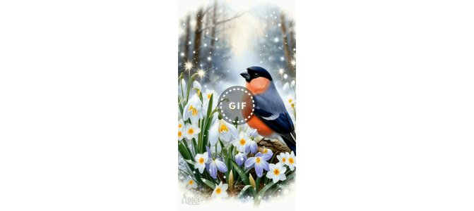 Теги:снегирь, птица, снег, зима, лес, гифка, анимация, красивая картинка, красивая анимация, пожелания на каждый день, цветы