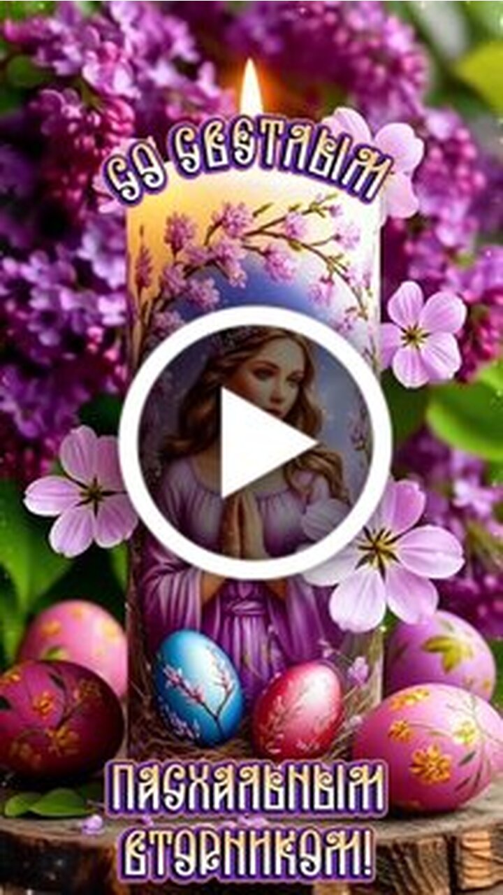 Это атмосферное видео посвящено празднику Пасхи и наполнено весенней эстетикой. В центре внимания находится красивая зажженная свеча, украшенная изображением молящейся девушки в окружении нежных цветов и пасхальных яиц. Видео сопровождается теплыми пожеланиями на русском языке. Сюжет плавно переходит от поздравления с пасхальным вторником к пожеланиям теплого, душевного дня, полного добра, понимания и спокойствия. Пышные фиолетовые цветы сирени создают праздничное и умиротворяющее настроение, делая это видео идеальным для отправки близким в качестве светлого поздравления.