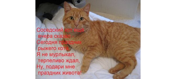 Теги:соседский, кот, ещё, вчера, сказал, сегодня, праздник, рыжего, кота, я не мурлыкал, терпеливо ждал, подари мне праздник живота