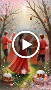 Красивое праздничное видео в славянском стиле посвященное Пасхе. В центре сюжета группа молодых людей в традиционных народных костюмах танцует веселый хоровод в цветущем саду. Вокруг них летают яркие лепестки и праздничные яйца создавая атмосферу радости и весеннего обновления. Постепенно композиция меняется акцентируя внимание на влюбленной паре в центре кадра которая превращается в молодоженов в белых нарядах. Видео сопровождается поздравительными надписями на русском языке приносящими пожелания красной весны и большого счастья. Это теплое и эстетичное видео идеально подходит для передачи духа праздника и любви.