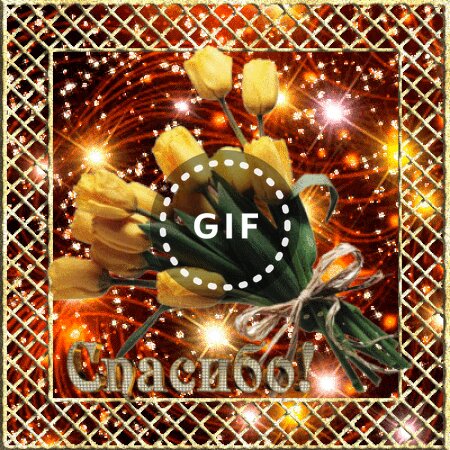 Красивая поздравительная открытка с букетом желтых тюльпанов на блестящем золотистом фоне с эффектом мерцающих огней и искр. На переднем плане расположена стильная надпись «Спасибо!» в серебристом блестящем стиле. Изображение обрамлено декоративной золотой сетчатой рамкой, что создает праздничное и торжественное настроение. Идеально подходит для отправки в мессенджерах и социальных сетях в качестве знака благодарности или для выражения теплых чувств близким людям.