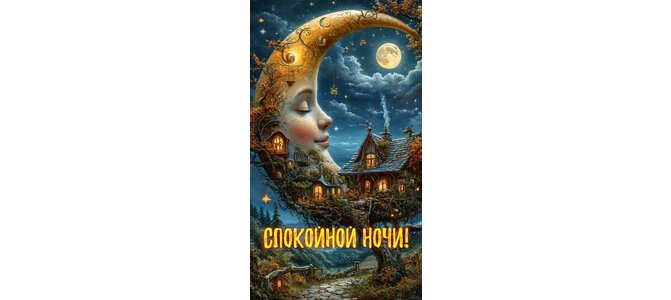 Сказочный месяц спит на небе. Надпись на открытке " Спокойной ночи!"