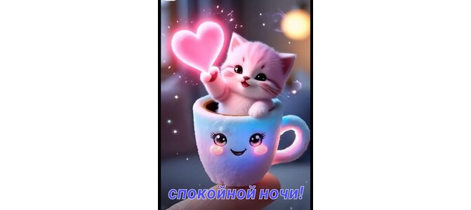 Мультяшный котëнок сидит в чашке, а в лапке держит сердечко. Спокойной ночи!