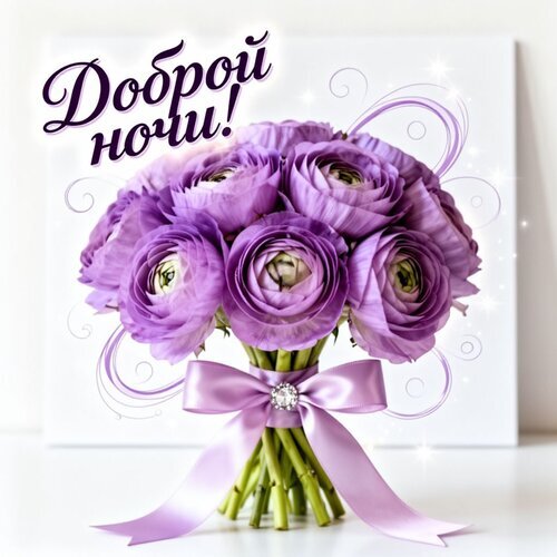 Красивая поздравительная открытка с пышным букетом нежных фиолетовых ранункулюсов. Цветы перевязаны атласной лентой с блестящей брошью и дополнены изящными завитками. Сверху расположена надпись на русском языке «Доброй ночи!». Идеальное изображение для отправки близким, друзьям или любимым в мессенджерах и социальных сетях, чтобы пожелать приятных снов и создать романтичное или уютное настроение.