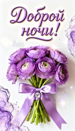 Красивая поздравительная открытка с надписью «Доброй ночи!» на белом фоне. В центре композиции — пышный букет нежных фиолетовых ранункулюсов, перевязанный атласной лентой с сияющим стразом. Изображение выполнено в элегантном стиле с добавлением мягких световых бликов и акварельных фиолетовых разводов, что создает атмосферу спокойствия, уюта и романтики. Идеально подходит для отправки в мессенджерах и социальных сетях для пожелания приятных снов близким людям.