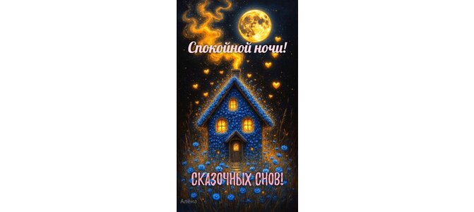 Сказочный домик с ярко освещëнными окнами, из речной трубы вьëтся золотистый дымок.