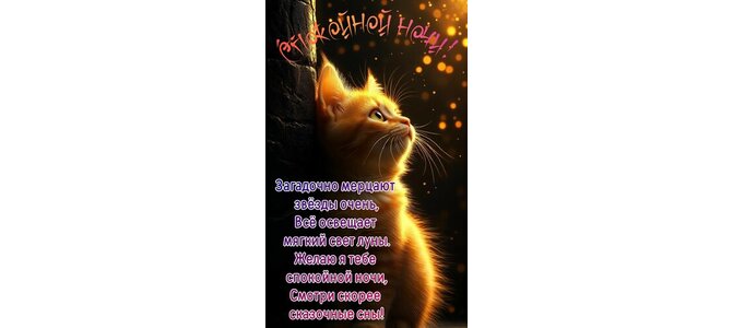 Загадочно мерцают звёзды очень, всё освещает мягкий свет луны. Желаю я тебе спокойной ночи, смотри скорее сказочные сны!