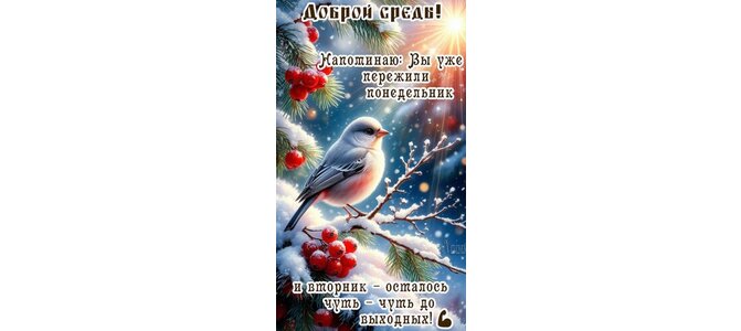 Теги:среда, дни недели, снег, зима, птичка, добрый день, доброй среды, чуть-чуть до выходных, позитива, красивая картинка