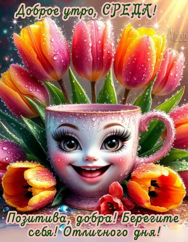 Теги:среда, дни недели, доброе утро, цветы, тюльпаны, позитива, бодрости, добра, берегите себя, красивая картинка, чашка
