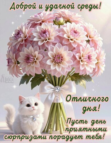 Красивая поздравительная открытка с пышным букетом нежно-розовых георгинов и милым маленьким белым котенком. На изображении надпись на русском языке: «Доброй и удачной среды! Отличного дня! Пусть день приятными сюрпризами порадует тебя!». Картинка наполнена светом, блестками и позитивной атмосферой, идеально подходит для отправки друзьям и близким в мессенджерах (WhatsApp, Viber) или социальных сетях для пожелания хорошего дня в среду.