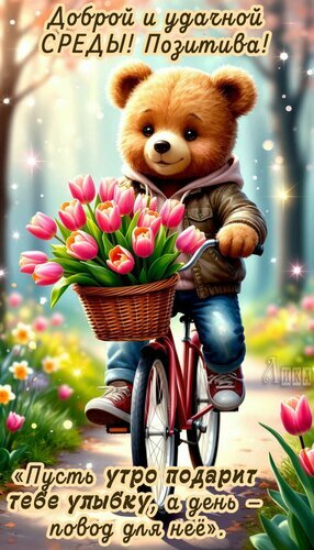 Милая и добрая открытка с плюшевым мишкой на велосипеде. Медвежонок везет корзину с яркими розовыми тюльпанами по залитой солнцем лесной тропинке. На изображении размещены вдохновляющие пожелания на русском языке: «Доброй и удачной СРЕДЫ! Позитива!» и «Пусть утро подарит тебе улыбку, а день — повод для неё». Идеальное изображение для отправки друзьям и близким в мессенджерах (WhatsApp, Viber) для создания позитивного настроения в середине недели.