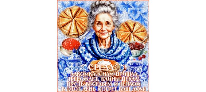 Открытка "Среда-лакомка к нам пришла. теща ждет. блины пекла"