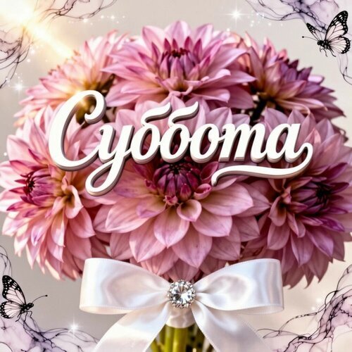Красивая поздравительная открытка с пышным букетом нежно-розовых георгинов. В центре композиции расположена стильная каллиграфическая надпись «Суббота» белым цветом с контуром. Изображение дополнено изящными деталями: парящими черными бабочками, сияющими бликами света и элегантным белым атласным бантом с блестящим камнем в центре. Фон выполнен в нежных мраморных тонах, создавая атмосферу праздника, уюта и эстетики. Идеально подходит для отправки в мессенджерах и социальных сетях для пожелания доброй субботы.