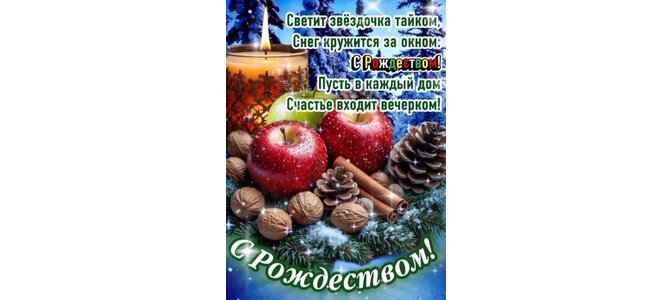 С Рождеством! Светит звёздочка тайком, снег кружится за окном: С Рождеством! Пусть в каждый дом счастье входит вечерком!