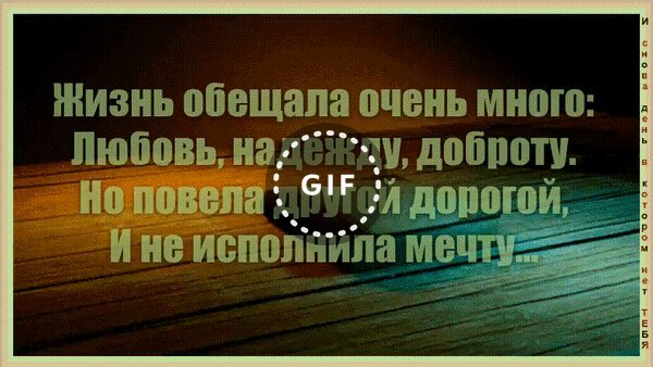 Картинка с глубокой философской цитатой на фоне деревянной текстуры. Текст на русском языке гласит: «Жизнь обещала очень много: Любовь, надежду, доброту. Но повела другой дорогой, И не исполнила мечту...». Изображение передает меланхоличное, задумчивое настроение и размышления о жизненном пути, судьбе и несбывшихся надеждах. Подходит для использования в социальных сетях, блогах о психологии и саморазвитии.