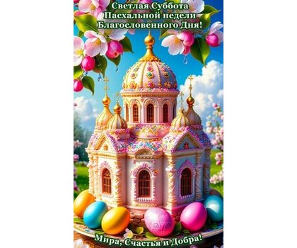 Красочная праздничная открытка к Светлой Субботе Пасхальной недели. На изображении представлен сказочный, детализированный храм в пастельных розовых и золотых тонах, напоминающий изысканный пасхальный кулич. Вокруг храма расположены яркие пасхальные яйца (крашенки) и нежные весенние цветы сакуры на фоне голубого неба с облаками. В верхней части текста на русском языке: "Светлая Суббота Пасхальной недели Благословенного Дня!", а внизу: "Мира, Счастья и Добра!". Изображение наполнено светом, радостью и весенним настроением, идеально подходит для поздравлений с Пасхой.