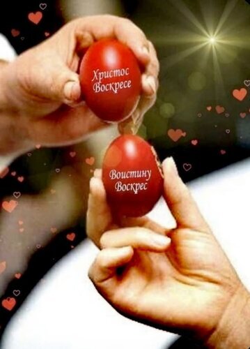 Праздничное изображение к Пасхе, на котором две руки держат два красных пасхальных яйца. На яйцах написан текст на кириллице: «Христос Воскресе» и «Воистину Воскрес». Фон украшен светящимися бликами, эффектом сияния и парящими красными сердечками, что создает атмосферу радости, веры и торжества светлого праздника Воскресения Христова. Изображение идеально подходит для поздравлений с Пасхой, открыток и религиозного контента.