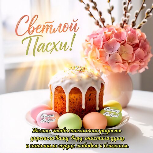 Светлой Пасхи! Христос Воскресе! Воистину Воскресе! Желаю, чтобы пасхальная радость укрепила вашу веру, очистила душу и наполнила сердце любовью к ближним.