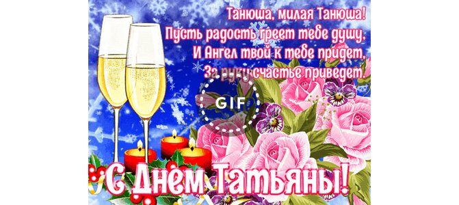 Танюша, милая Танюша! Пусть радость греет тебе душу. И Ангел твой к тебе придет, за руку счастье приведет. С Днем Татьяны!