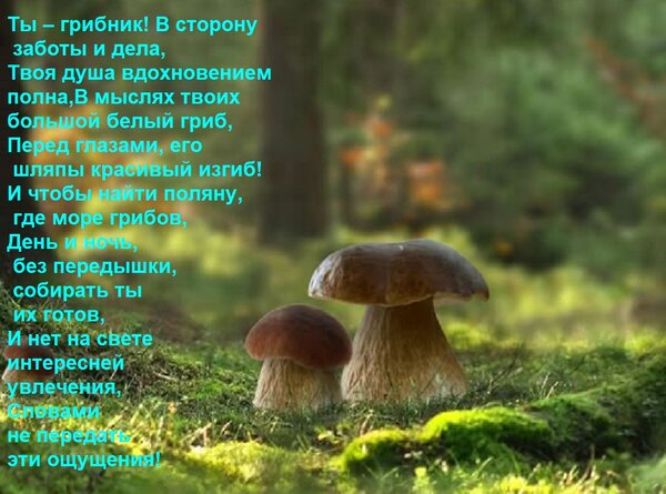 Теги:ты грибник в сторону заботы и дела, твоя душа вдохновением полна, в мыслях твоих большой белый гриб, перед глазами, его, шляпы, красивый, изгиб, чтобы, найти, поляну, где море грибов, день и ночь