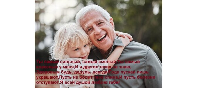 Теги:ты самый сильный, самый смелый, ты самый классный у меня, и я других таких не знаю, здоровым будь, дедуль, всегда года пускай лишь украшают, пусть не болит твоя спина, и пусть болезни отступают, я всей душой люблю тебя