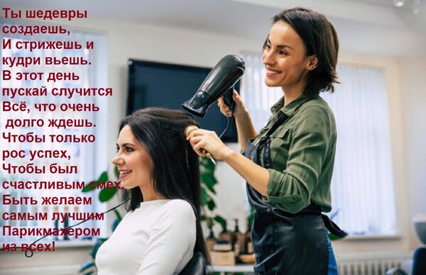 Открытка "Ты шедевры создаешь, И стрижешь и кудри вьешь. В этот день пускай случится Всё, что очень долго ждеш"