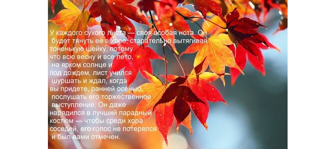 Теги:у каждого сухого листа своя особая нота он будет тянуть ее в хоре, старательно вытягивая тоненькую шейку, потому что всю весну и все лето, на ярком солнце и под дождем, лист учился шуршать и ждал, когда вы придете, ранней осенью, послушать его торжественное выступление он даже нарядился в лучший парадный костюм чтобы среди хора соседей, его голос не потерялся и был вами отмечен